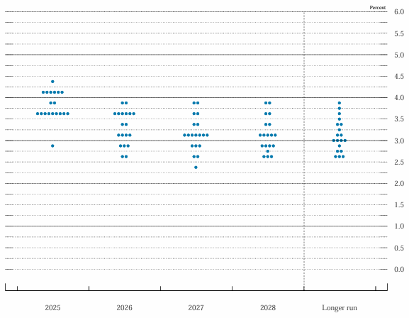 FOMCが示した2025年末の政策金利見通し(ドットチャート)では、金利の中央値が3.50%~3.75%のレンジに設定されました。これは、9月に実施された0.25%の利下げに加え、年内にあと2回の追加利下げを行うことを示唆しており、一見するとFOMC全体が積極的な金融緩和を考えているように見えます。